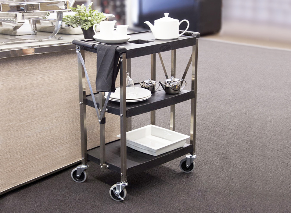 堅(jiān)厚的不銹鋼材料,車表面帶有磨砂處理,美觀耐用卡扣設(shè)計(jì),可快速、簡(jiǎn)單的折疊或展開餐車; 折疊存放可減少50%的面積; 符合人體工學(xué)的把手設(shè)計(jì),操作舒適; 4”萬(wàn)向靜音輪,其中兩個(gè)帶剎;安全,安靜可承重150KG; 廣泛使用于各類餐廳和酒店.